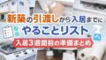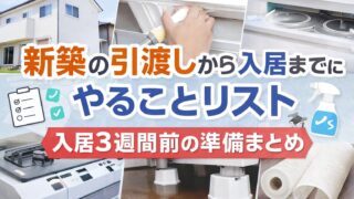新築準備・入居前 新築の引渡しから入居までにやることリスト【入居前3週間の準備まとめ】 新築の引渡しから入居まで約3週間の準備内容を、共働き夫婦の実体験ベースで詳しくまとめました。コーキングや防カビ対策、虫対策、入居前掃除など、新築をきれいに保つために入居前にやる予定のことを具体的に紹介しています。 2026.02.26 新築準備・入居前