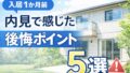 新築準備・入居前 新築で後悔しないために考えたこと,現時点での後悔ポイント 新築の入居1ヶ月前の内見で実際に感じた後悔ポイントを5つ紹介します。家づくりをしたリアルな体験談。これから家を建てる方が後悔しないための参考になれば嬉しいです。 2026.02.10 新築準備・入居前