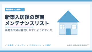 新築準備・入居前 新築入居後の定期メンテナンスリスト【共働き夫婦が管理しやすいようにまとめ】 新築入居後に定期的にやるべきメンテナンスをリスト化しました。お風呂・キッチン・トイレ・エコキュート・太陽光パネルなど、共働き夫婦が無理なく続けられる頻度でまとめています。新築をきれいに保ちたい方はぜひ参考にしてください。 2026.03.30 新築準備・入居前